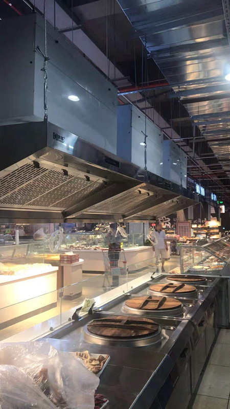 萬科旗下大型美食廣場應用案例,不需要連接復雜的排煙管道,節省大量材料成本,和人工清洗成本,室外“0”排放,室內室外無污染。